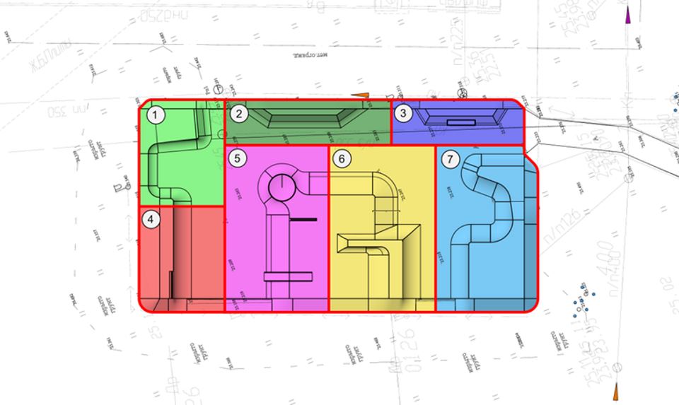 Из модулей предусмотрены: минирампа с двумя хипами, двумя покетами и минивертволом (модуль 1 на схеме); чайнабенк с хипами (2); мини чайнабенк с гранью (3); квотер двухуровневый (4); стрит плаза с двумя гранями и чашей (5); стрит плаза с перелой, чайнобенком и минифанбоксом (6); разгонный двух уровней квотер с большим столом двумя хипами и волрайдом (7).