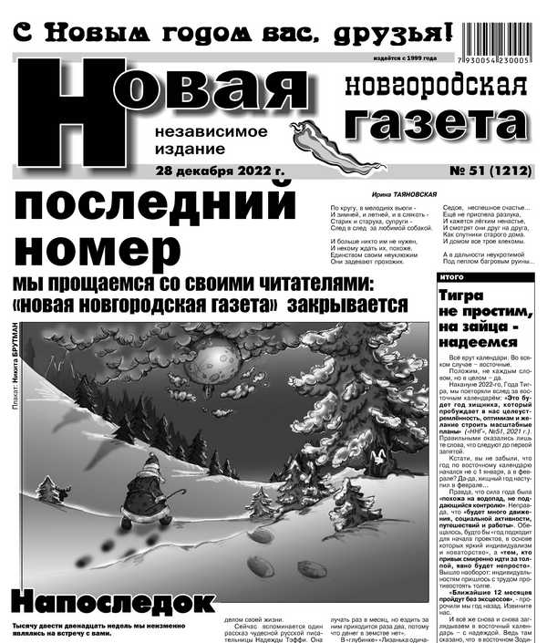 ОДНА из давнишних читательниц и автор нескольких публикаций, узнав о закрытии газеты, сказала мне: поздравь всех с Новым годом, поблагодари своих коллег за общение и сотрудничество, а нас, новгородцев, – за преданность газете.