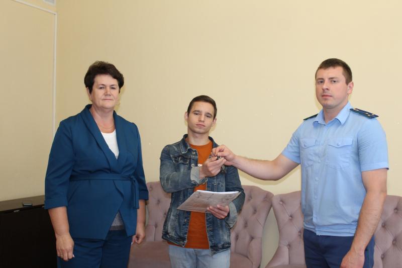 Поздравляем молодого человека Косяк Игоря Алексеевича, которому первый заместитель Главы Администрации Окуловского муниципального района Петрова Марина Олеговна и помощник прокурора Цыба Роман Васильевич вручили ключи от благоустроенной квартиры.