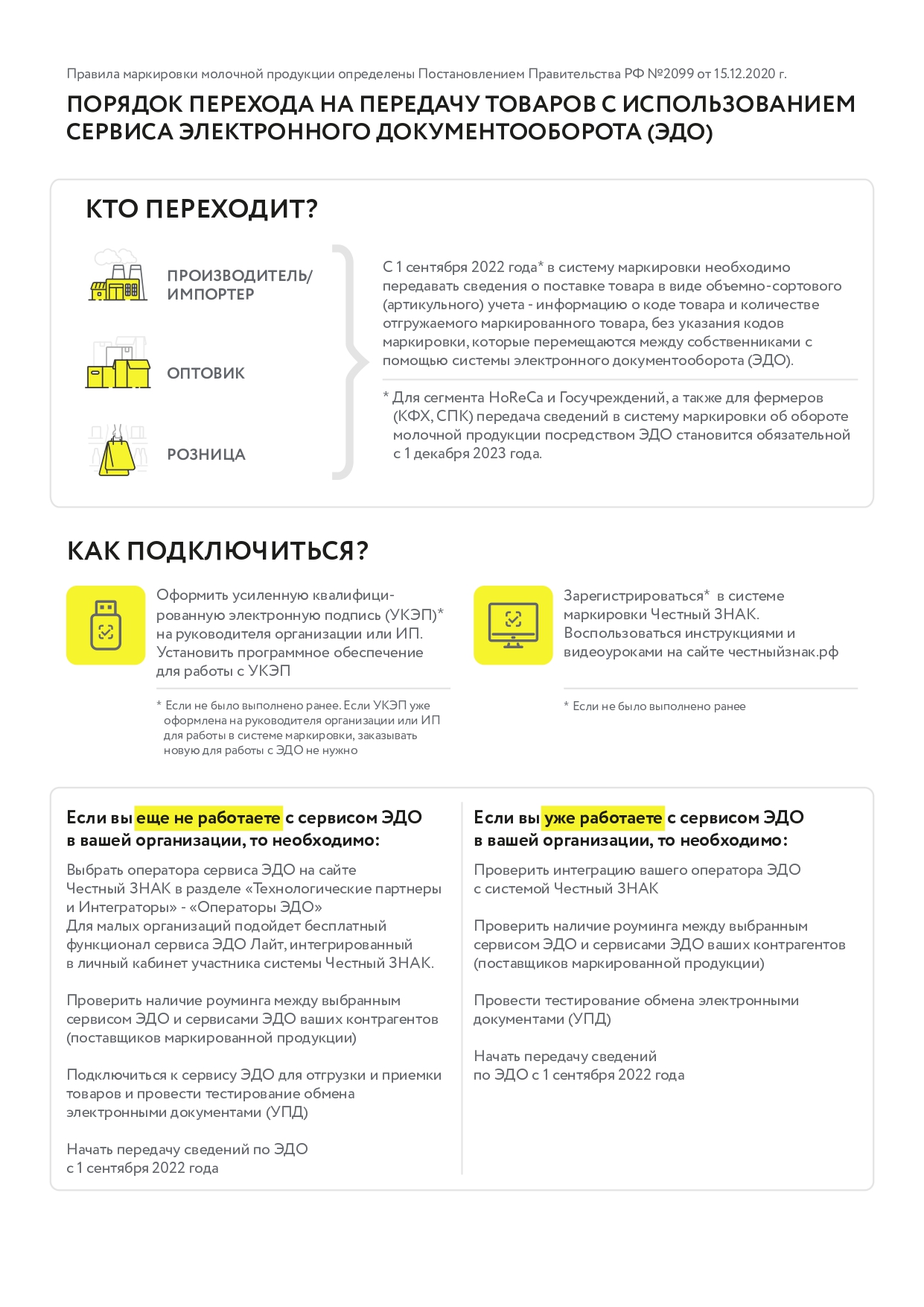 * Для сегмента HoReCa и Госучреждений, а также для фермеров (КФХ, СПК) передача сведений в систему маркировки об обороте молочной продукции посредством ЭДО становится обязательной c 1 декабря 2023 года.