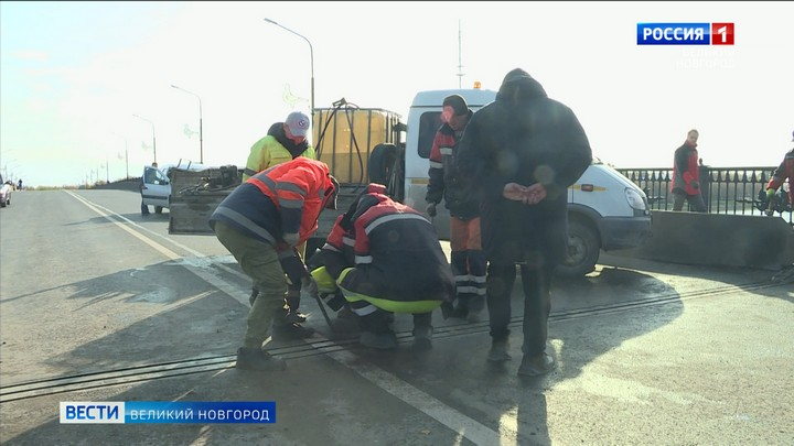 На мосту Александра Невского в Великом Новгороде прошли осенние работы по замене уплотнителей деформационных швов