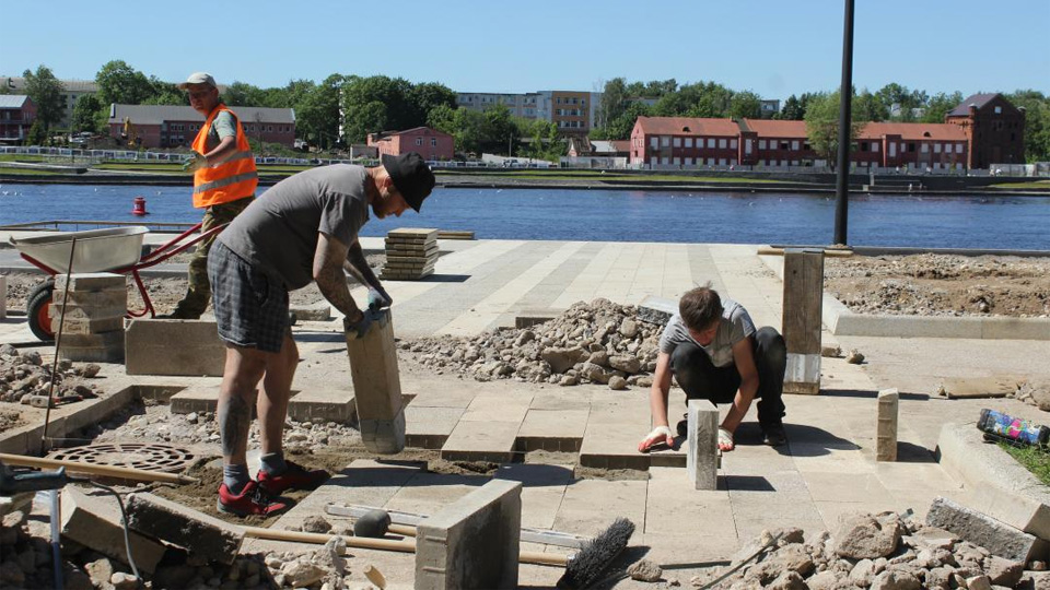 По данным администрации, выполнено устройство водопровода, бытовой канализации, ливневой канализации, наружного освещения, бетонных модульных сидений, смотровых площадок, подпорных стенок, лестниц, берегоукрепление, пандусов, установку понтонов, монтаж оборудования фонтана, оборудования детской игровой и спортивной площадки, устройство велодорожки, бетонирование железобетонной плиты (основание под туалет), фундамента под памятник Александру Невскому, основания под асфальтирование.