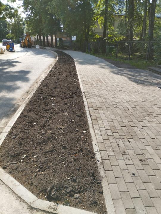 Установлен бортовой камень и уложена тротуарная плитка, после проведения работ восстановлены нарушенные объекты благоустройства (газоны).