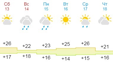 В воскресенье, 14 июля, синоптики обещают плюс 22 градуса. В этот день ожидается пасмурная погода и дождь.