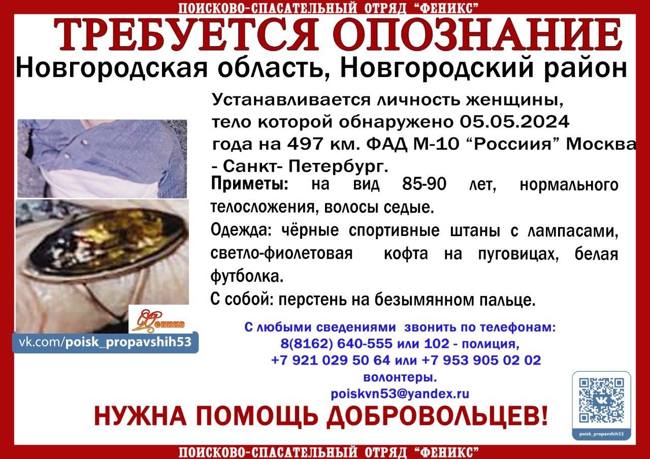 Поисково-спасательный отряд «Феникс» просит помочь в установлении личности пожилой женщины, которая погибла вечером 5 мая в Новгородском районе на 497-м километре трассы М-10.