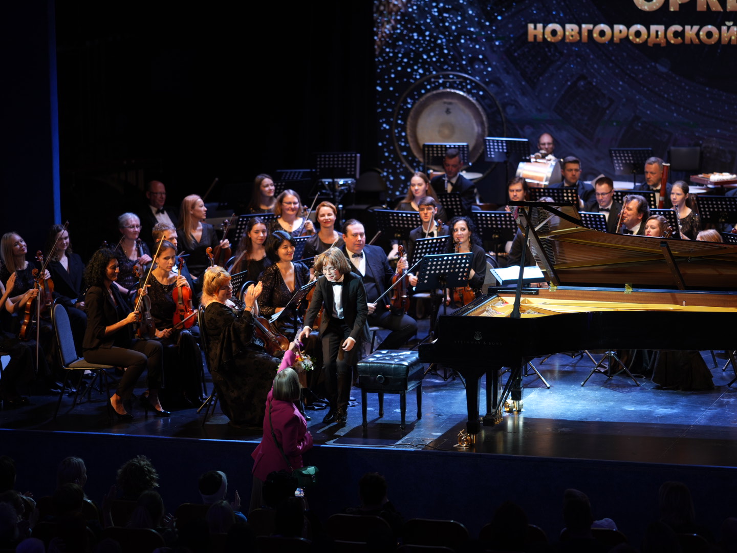 На новом рояле «Стейнвей» солировал молодой, талантливый и уже знакомый новгородской публике пианист – Лев Бакиров. Лев лауреат всероссийских и международных конкурсов, обладатель Гран-при Первого Международного юношеского конкурса пианистов им. С. В. Рахманинова, который в марте прошел в Великом Новгороде под руководством Дениса Мацуев.
