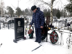 В Чудово сотрудники вневедомственной охраны Росгвардии навестили могилу военнослужащего внутренних войск МВД — старшего лейтенанта Вадима Скрыпникова. Офицеры Росгвардии возложили в знак памяти и уважения подвигу коллеги цветы, почтили его память минутой молчания.