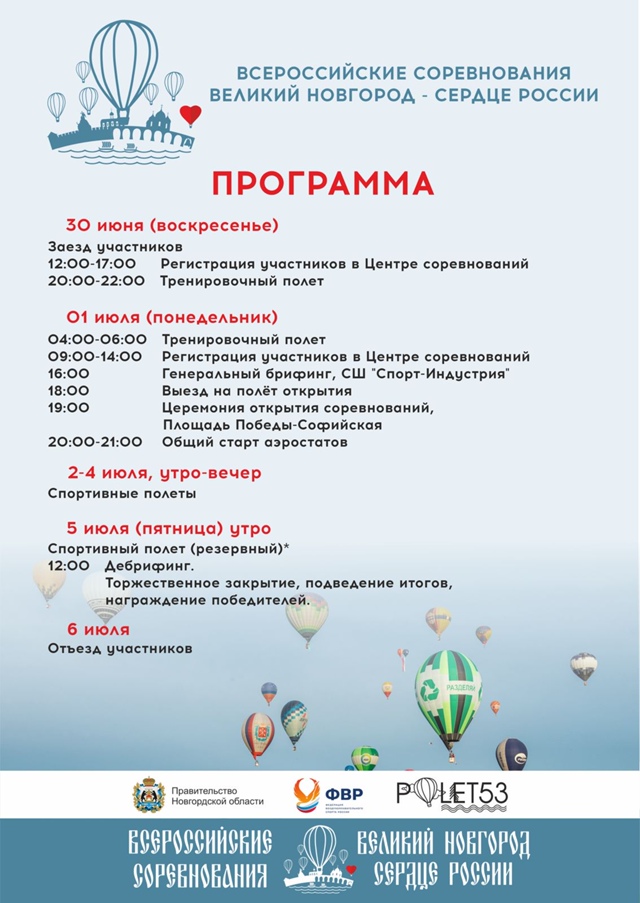 1 июля 2024 года в 19:00 на площади Победы-Софийской состоится торжественное открытие Всероссийских соревнований по воздухоплавательному спорту «Великий Новгород – сердце России».