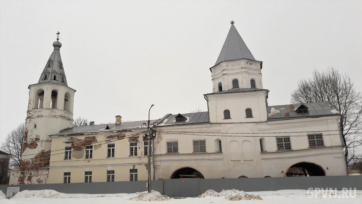— В ходе реставрационных работ обнаружена была стенка колокольни, которая ранее была скрыта. Так как это три разных объекта, но они стоят вплотную друг к дружке, имеют разные входы, разную отделку и так далее, со временем колокольня и корпус надвратный в XVII веке были присоединены к Гостиному двору (то есть к Торгу). Позже пристраивалось и их соединило училище народное. Оно несколько раз перестраивалось и в конечном итоге поглотило одну из частей колокольни. Сейчас при реставрации мы её открыли, — рассказала заместитель генерального директора Новгородского музея-заповедника по реставрации, капитальному ремонту и инженерному обеспечению Валерия Хорошевская.
