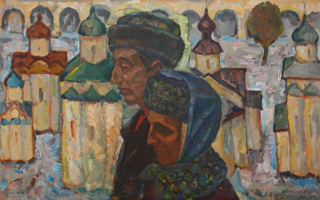 — В произведениях 1960-ых годов город и храмы узнаваемы. Но они не копии реальных, прошедших через столетия испытаний, иногда грубо изменённых временем, а будто вновь рождённые, только вышедшие из рук зодчего. Город вырастает перед зрителем как некое чудо, он живой — в нём скачут всадники, по Волхову плывут ладьи, на Торгу толпятся пёстро одетые горожане.