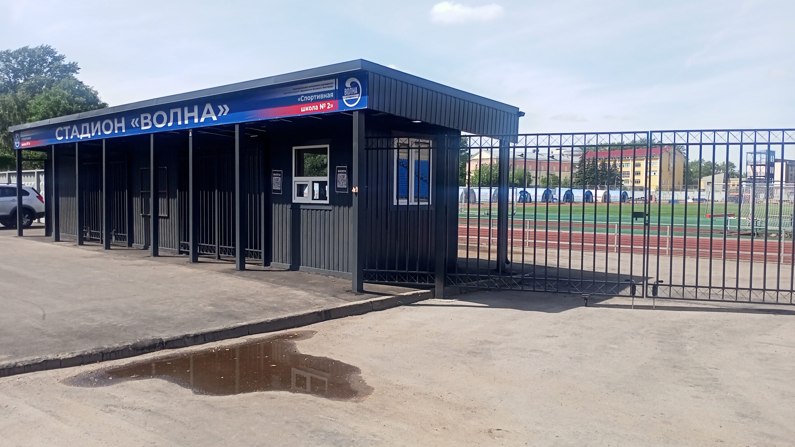 Стадион «Волна» в Великом Новгороде преобразился. Полностью обновленной оказалась входная группа, включая небольшую парковку около главных ворот.