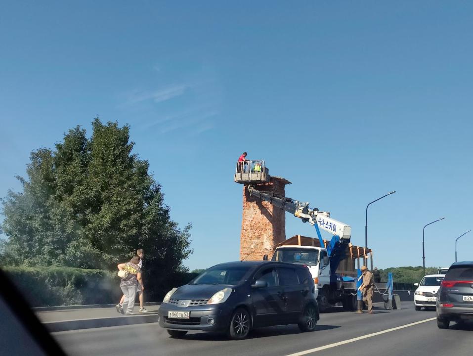 На мосту Александра Невского начался демонтаж кирпичных стел. Старая конструкция была неустойчивая и грозила обрушением.