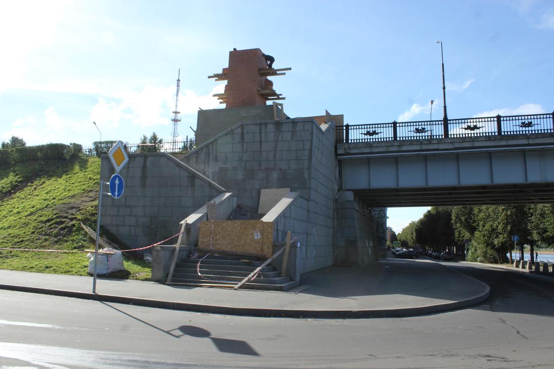 Подрядная организация ООО «СПК» продолжает вести ремонтные работы на стелах моста Александра Невского. Новая кладка одной из стел практически завершена.
