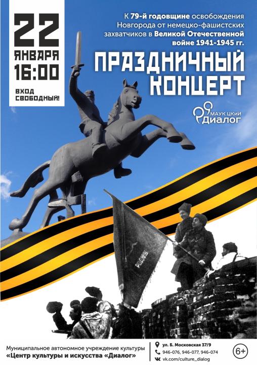22 января в 16:00 в Центре культуры и искусства «Диалог» (ул. Большая Московская, д. 37/9) состоится концерт, посвященный 79-й годовщине освобождения Новгорода от немецко-фашистских захватчиков.