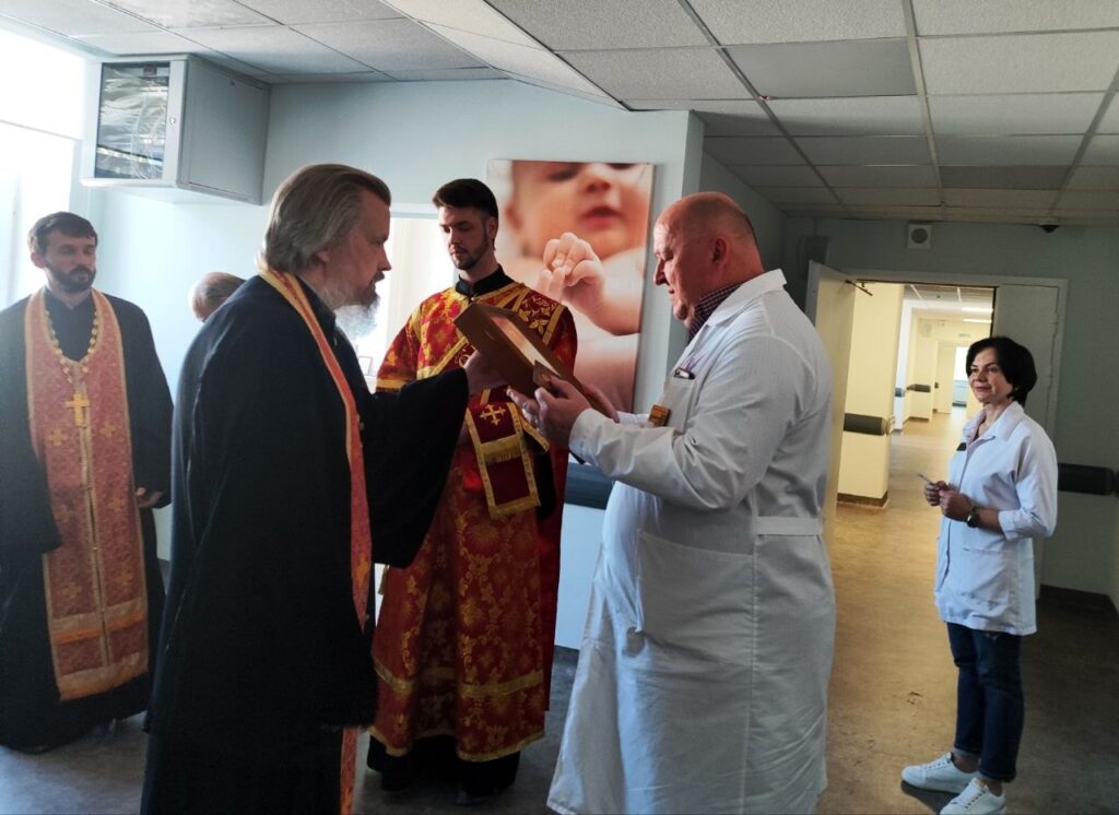 В подарок акушерскому стационару священнослужитель вручил главному врачу Александру Андриенко Казанскую икону Божий Матери — одну из самых чтимых икон Русской православной церкви.