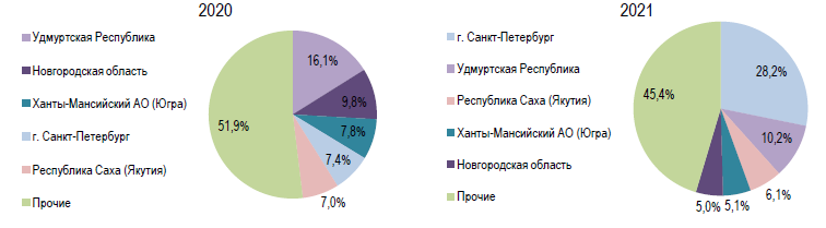 Лидируют г. Санкт-Петербург (269 контрактов), Удмуртская Республика (97 контрактов), Республика Саха (Якутия) (58 контрактов), Ханты-Мансийский АО (Югра) (49 контрактов), Новгородская область (48 контрактов).