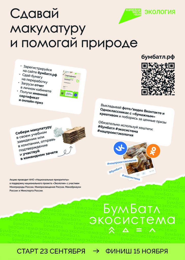С 23 сентября по 15 ноября в России пройдет пятый сезон Всероссийской экологической акции «БумБатл», организованной АНО «Национальные приоритеты» совместно с Всероссийским экологическим общественным движением «Экосистема».
