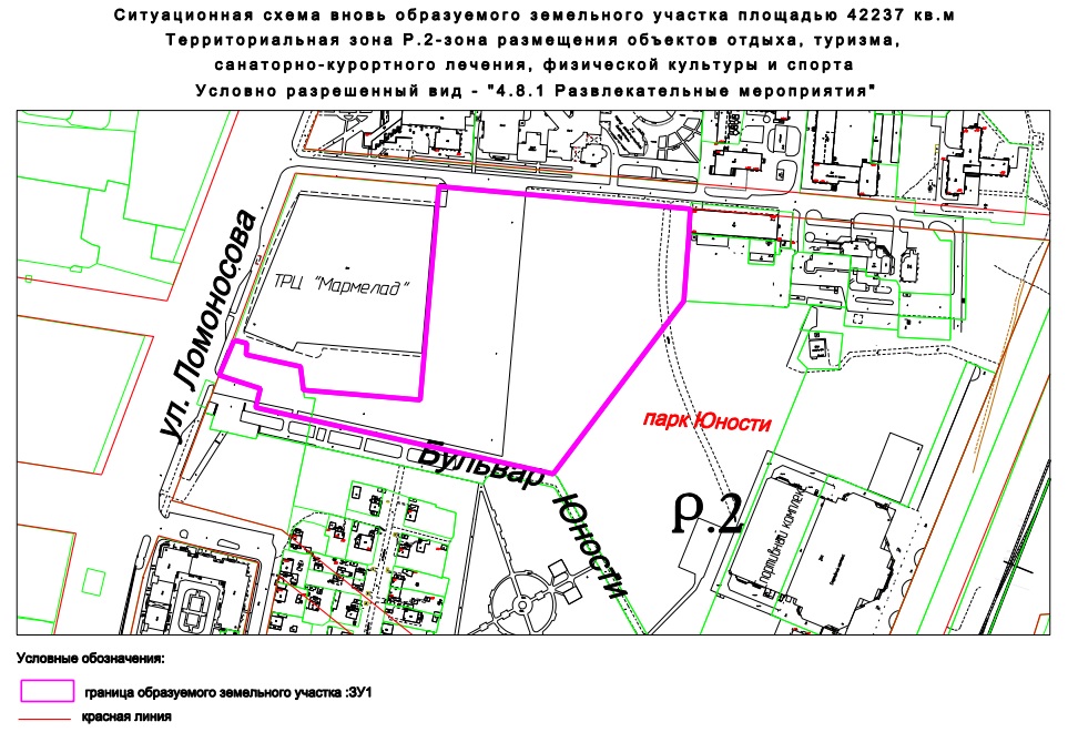 В образуемый участок входит большая часть автомобильной парковки у ТРЦ «Мармелад», а также ещё не благоустроенная территория парка Юности между бульваром Юности и улицей Боткина. Напомним, ранее эта территория рассматривалась под размещение аквапарка.