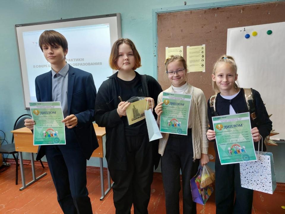 Креативная и творческая команда школы № 13 в составе учеников 5-8 классов Анны Сафроновой, Агнии Барановой, Марии Вяткиной и Александра Бойцова стала победителем муниципального этапа метапредметной олимпиады "Познавай! Придумывай! Пробуй!".