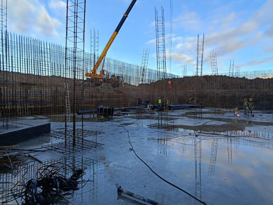 По информации администрации Великого Новгорода, на объекте подрядная организация завершает монтаж ж/б трубы между камерами, бетонирование стен резервуара (более 50%). По проекту объем бетона по резервуару составляет 5625,2 м3, из них залили 3616,2 м3. Приступила к устройству основания под резервуар шлама и проездов ЛОС.