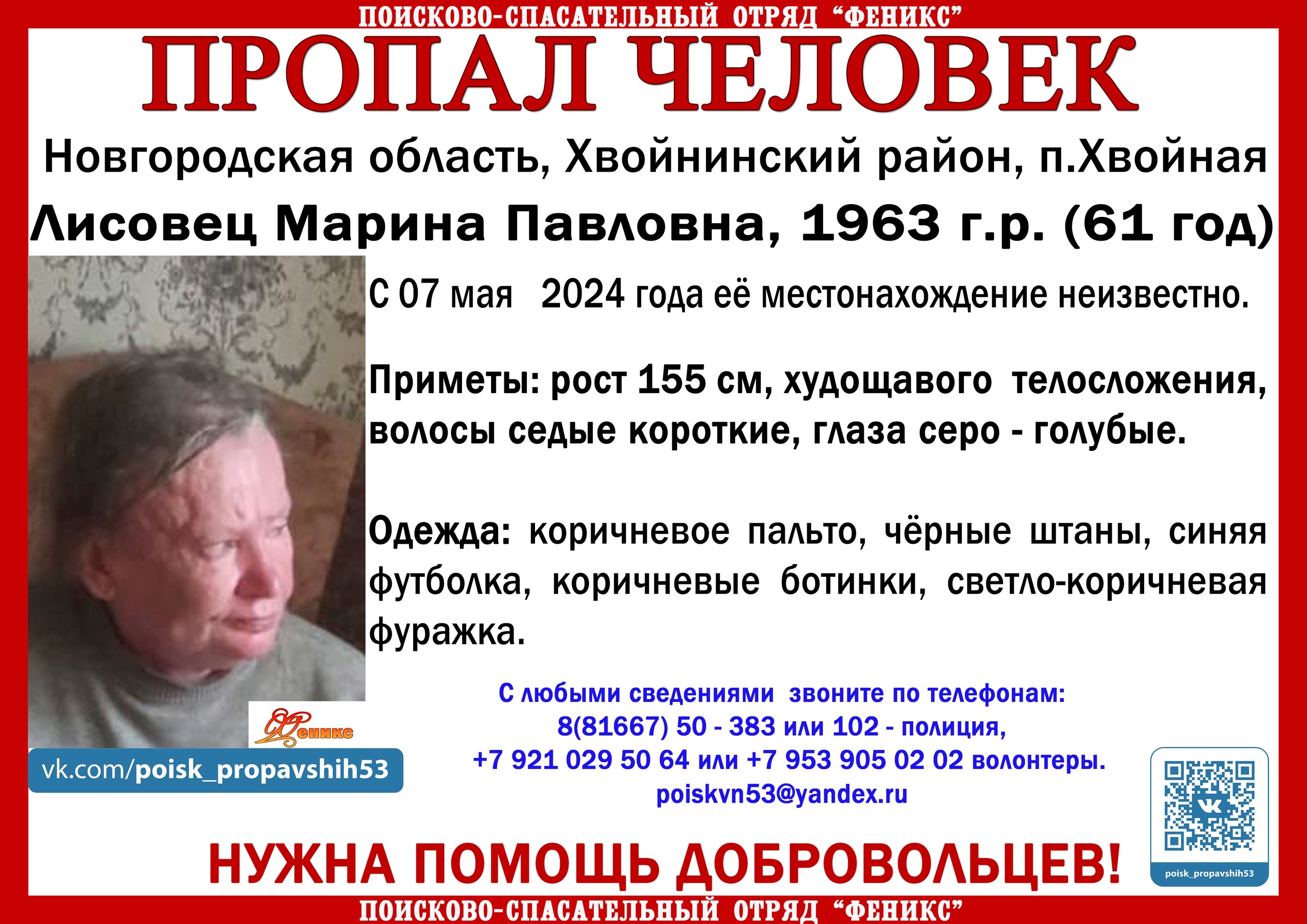 С любыми сведениями о пропавшей звоните по телефонам: 8 (81667) 50-383 или 102 — полиция, +7 921 029 50 64 или +7 953 905 02 02 — волонтёры.