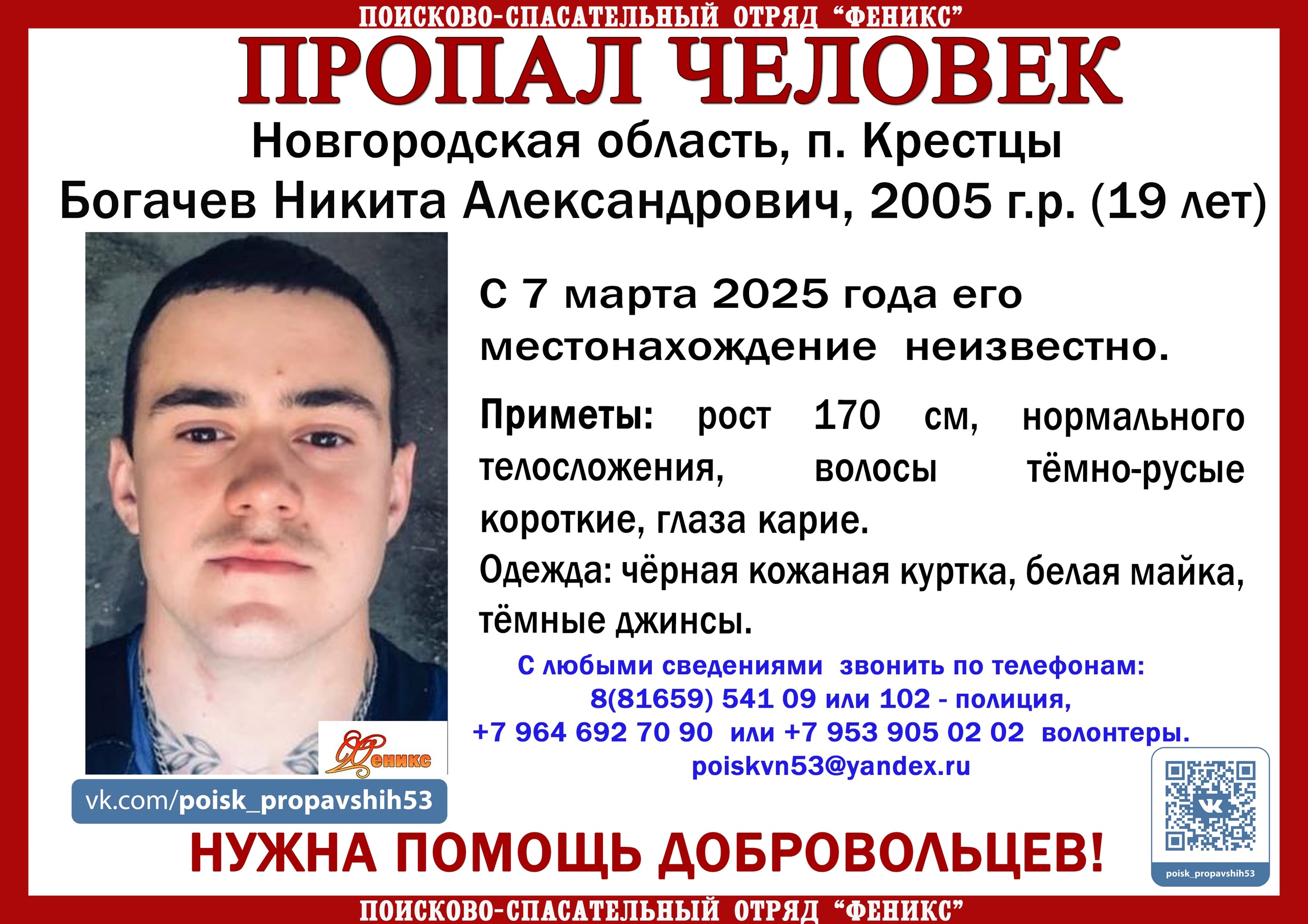 С любой информацией о пропавшем звоните по следующим номерам: 8 (81659) 541 09 или 102 — полиция, +7 964 692 70 90 или +7 953 905 02 02 — волонтёры.