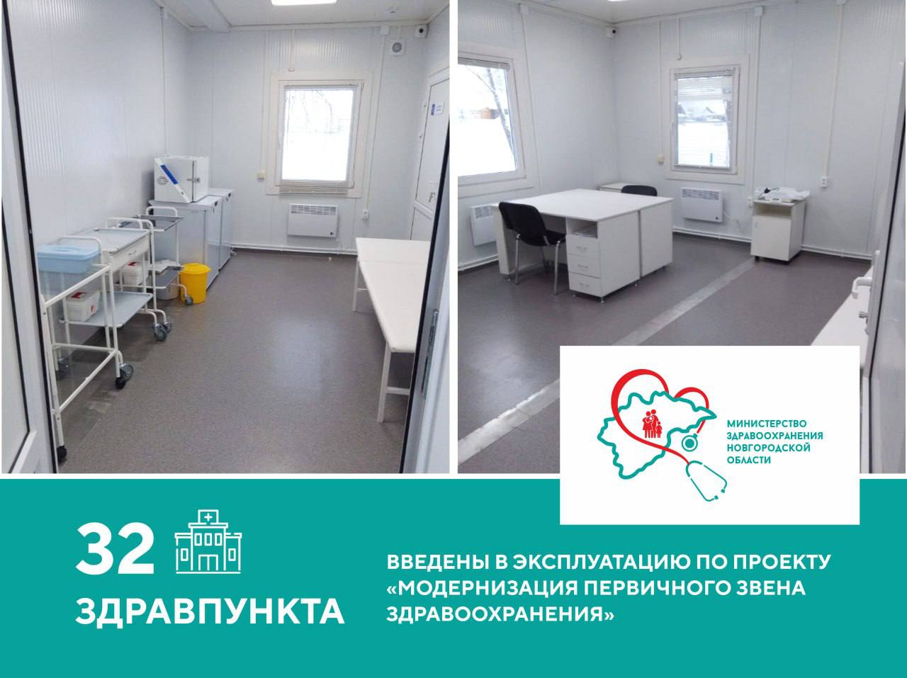 В рамках федерального проекта «Модернизация первичного звена здравоохранения» национального проекта «Здравоохранение» в 2023 году установлены 32 новые быстровозводимые модульные конструкции в Боровичском, Демянском, Любытинском, Новгородском, Окуловском, Пестовском, Старорусском, Шимском и Солецком районах.