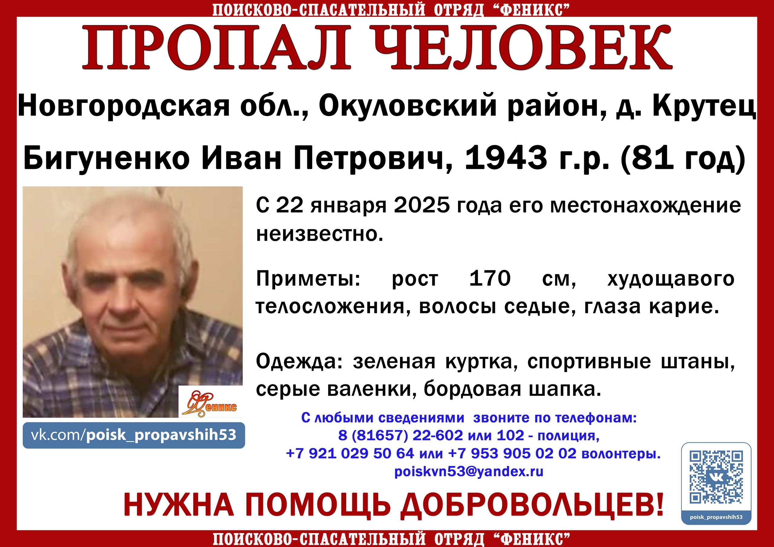 С 22 января неизвестно местонахождение 81-летнего жителя деревни Крутец Окуловского района Ивана Петровича Бигуненко. Об этом сообщает поисково-спасательный отряд «Феникс-Боровичи».