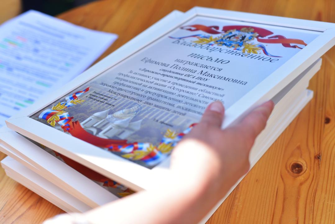 "За содействие в реализации основных направлений молодежной политики и личный вклад в воспитание подрастающего поколения Великого Новгорода" : заведующей региональным профилактическим детского дорожно-транспортного травматизма "Дорожно-транспортного техникума" Светлане Михайловой, директору "Дорожно-транспортного техникума" Андрею Мурашову.