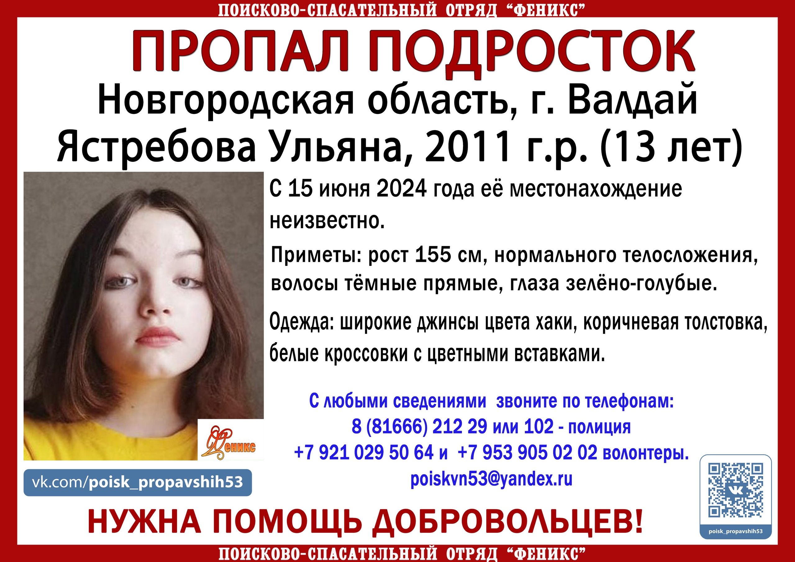 С 15 июня неизвестно местонахождение 13-летней жительницы Валдая Ульяны Ястребовой. Об этом сообщает поисково-спасательный отряд «Феникс-Боровичи».