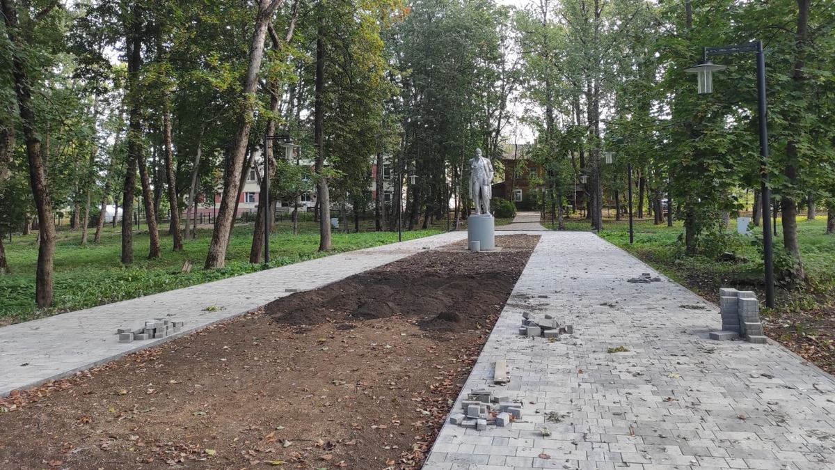 Второй этап предполагал устройство пешеходной дорожки, установку малых архитектурных форм. Подрядчик организовал входную группу, которая в точности повторяет оформление территории советских времён.