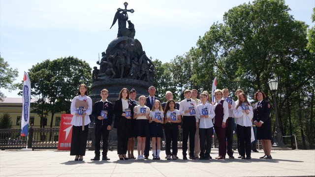 Сегодня в Великом Новгороде у памятника «Тысячелетие России» состоялась торжественная церемония вручения паспортов юным новгородцам, вступившим в ряды Российского движения детей и молодёжи «Движение первых». Участниками события стали родители школьников, представители общественных организаций, жители и гости города, официальные лица.
