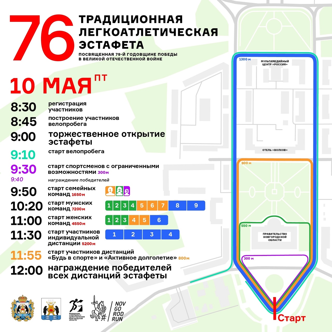 Завтра, 10 Мая, в центре Великого Новгорода с 8:00 до 12:00, в период проведения 76-й легкоатлетической эстафеты, ограничат движение автомобильного транспорта.