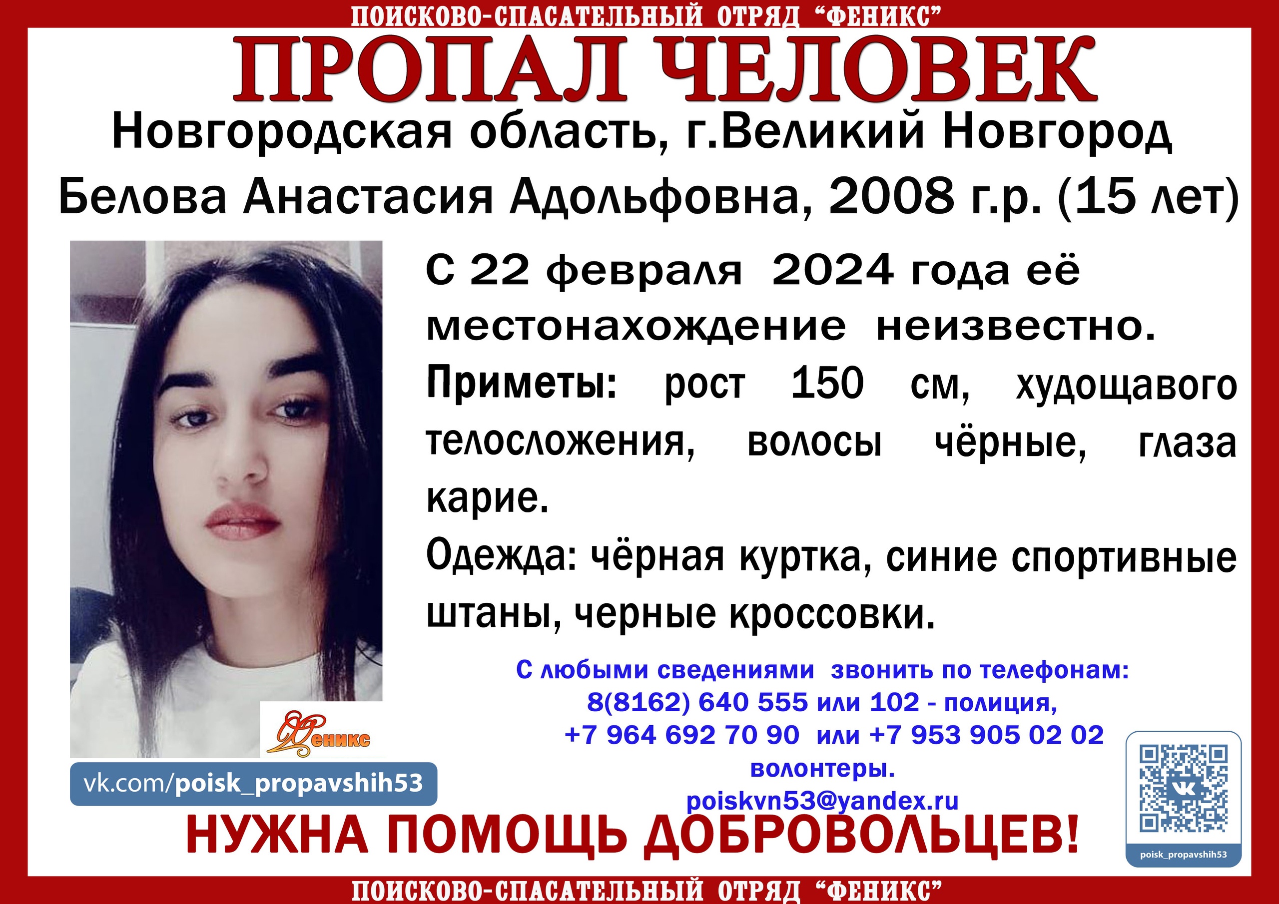 С любой информацией о пропавшей звоните по следующим номерам: 8 (8162) 640 555 или 102 — полиция, +7 964 692 70 90 или +7 953 905 02 02 — волонтёры.