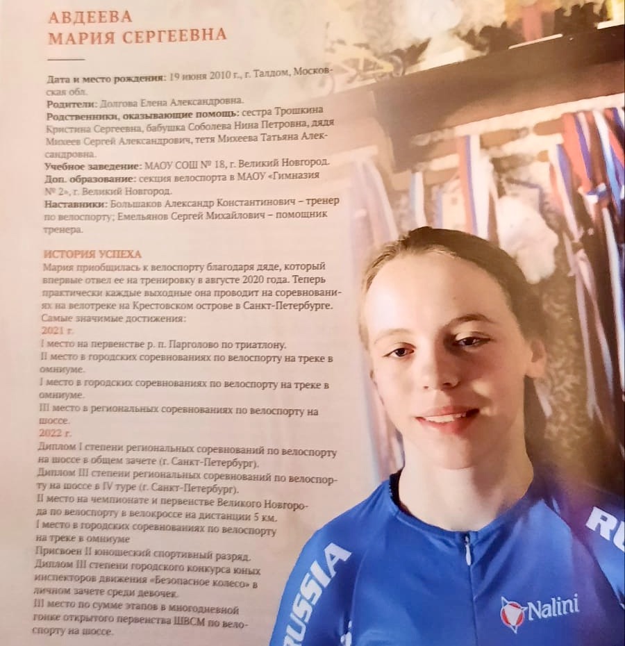 Новгородская спортсменка Мария Авдеева, воспитанница велосекции гимназии № 2, включена в Энциклопедию детских достижений СЗФО.