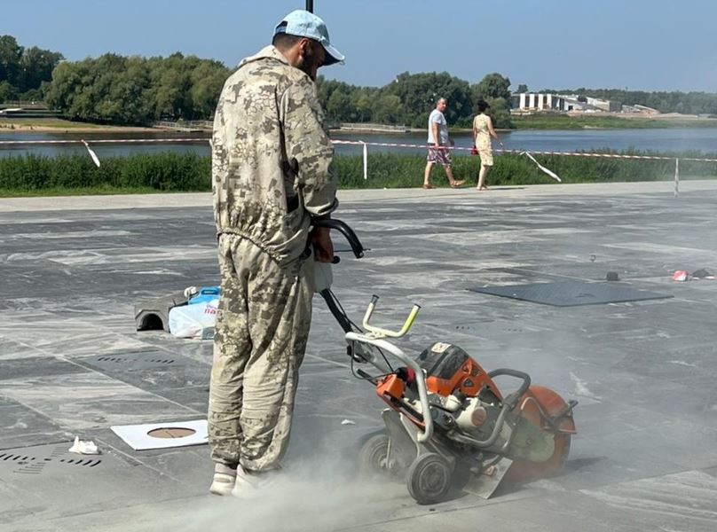 Как оказалось, проектом реконструкции набережной не был предусмотрен поверхностный водоотвод с прилегающей к фонтану территории. Поэтому был разработан проект на соответствующие работы. Рабочие выполняют устройство водоотводных лотков для сбора и отвода воды в ближайший ливневой колодец.