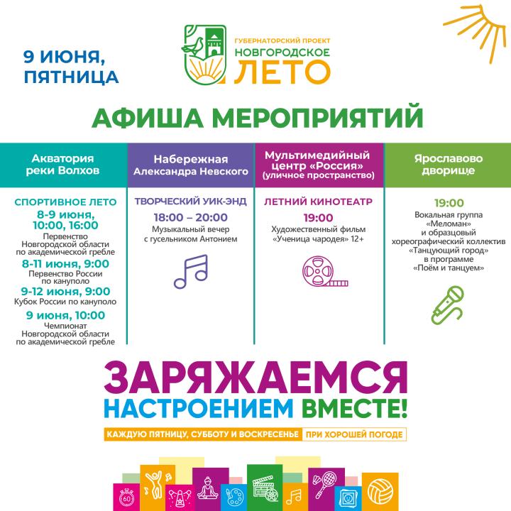 Приглашаем новгородцев провести яркие выходные вместе с летним фестивалем "Новгородское лето". Афишу событий с 9 по 12 июня см. выше.