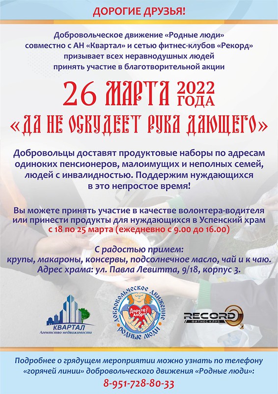 Добровольческое движение «Родные люди» проводит акцию совместно с АН «Квартал» и сетью фитнес-клубов «Рекорд».