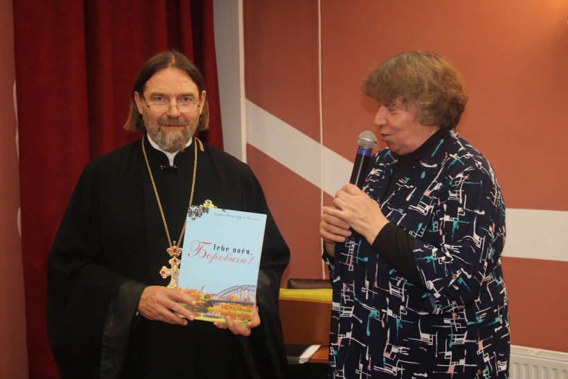В завершение настоятель Успенского собора отец Иоанн Мороко, член Боровичского отделения «БОЕВОГО БРАТСТВА», вручил цветы трём участницам церковного хора, чьи песни также вошли в сборник «Тебе поём, Боровичи», руководителю клуба «В мире прекрасного» Наталье Пуцит и регенту хора Ларисе Мороко.