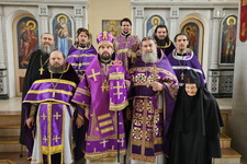 Его Преосвященству сослужили наместник монастыря игумен Нектарий (Блинов) и братия обители в священном сане.