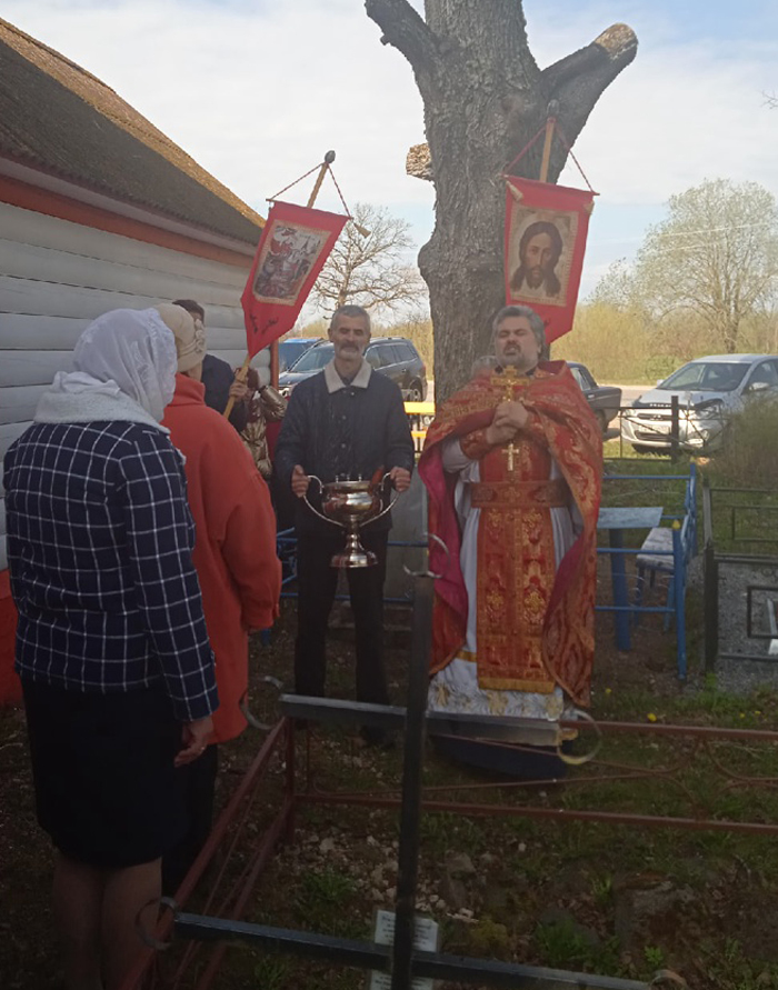 В своё время мы уже писали, что, готовясь к празднику, силами прихожан и спонсоров в октябре прошлого года расчистили приходское кладбище, спилили 17 ставших опасными деревьев, поборолись с мусором. А также расчистили руины и установили таблички, что это место относится к разрушенной в войну церкви святого Георгия. Нынешней осенью планируем огородить эту территорию, благо она расчищена.