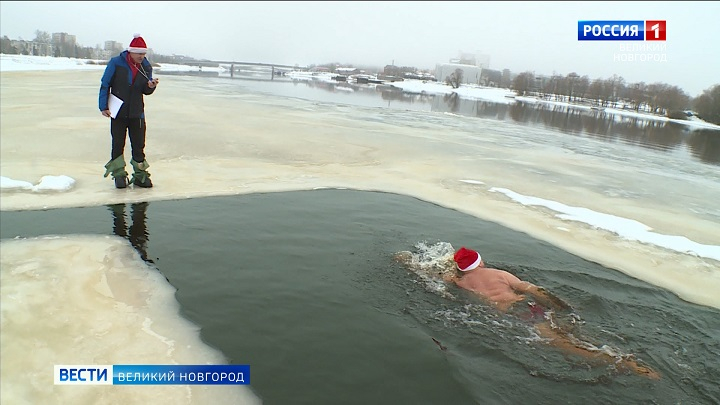 Сильные морозы не помешали новгородским моржам провести новогодний заплыв в Волхове