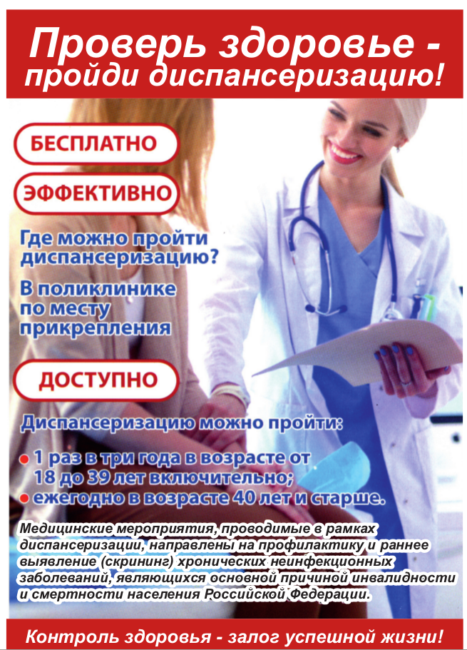Медицинские мероприятия, проводимые в рамках профилактического осмотра и диспансеризации направлены на профилактику и раннее выявление (скрининг) хронических неинфекционных заболеваний, являющихся основной причиной инвалидности и преждевременной смертности населения Российской Федерации, факторов риска их развития, а также в целях определения групп здоровья и выработки рекомендаций для пациентов.