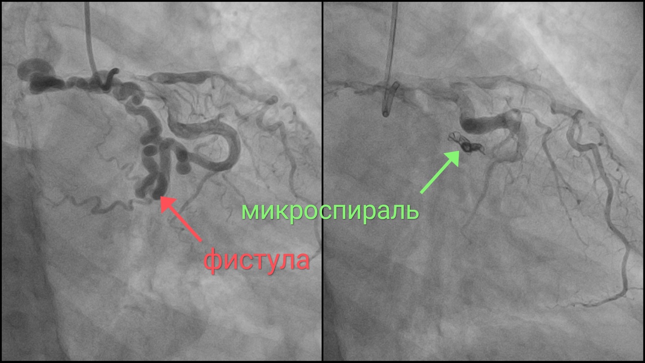 Как нам удалось узнать из пояснений специалистов, фистулой называется патологический канал (другое название «свищ») — в данном случае между коронарной артерией и легочным стволом. Эмболизация, говоря по-русски, есть закупорка канала специальными эмболами.