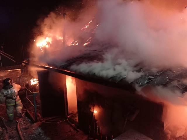 На момент прибытия пожарных подразделений дом горел открытым пламенем, произошло обрушение кровли, существовала угроза соседним строениям.